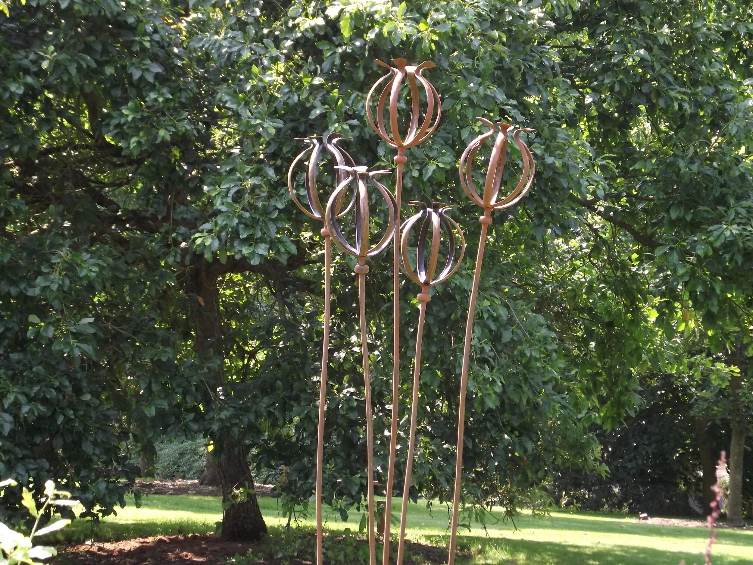 Poppy pod sculpture in rusted finish. (8ft tall)